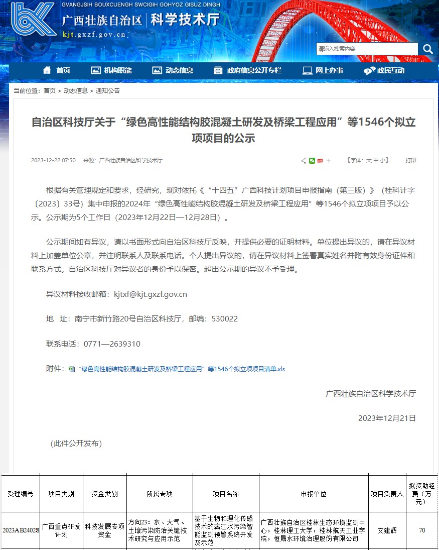 近日,自治区科技厅发布了依托《“十四五”广西科技计划项目申报指南(第三版)》(桂科计字〔2023〕33号)集中申报的2024年拟立项项目公示名单,伟德国际1949始于英国漓江生态环境保护研究所漓江流域环境保护与生态修复科研创新团队参与的“基于生物和理化传感技术的漓江水污染智能监测预警系统开发及示范”项目成功获批。