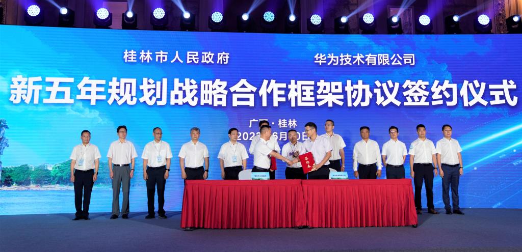会上自治区政府副秘书长、大数据发展局局长杨绿峰,桂林市委书记周家斌,桂林市副市长、市政府秘书长蒋春华,桂林市副市长王昕,华为数字能源技术有限公司中国区总裁周建军,华为广西总经理刘涛等领导参加会议并致辞。桂林市人民政府和华为技术有限公司签署了《桂林市人民政府&华为技术有限公司新五年规划战略合作框架协议》,并举办了桂林华为云计算数据中心二期暨桂北智算中心启动仪式,广西电网有限责任公司、中国移动广西公司、中国电信广西分公司等企业高管围绕“数智转型“、”双碳战略“、”绿色低碳社会构建”等主题进行主题汇报和交流,共同推进“一中心三基地”“数字桂林”“低碳桂林”等项目,实施数据驱动战略,促进数字经济及低碳经济发展,把桂林市建设成为低碳和新型智慧城市。