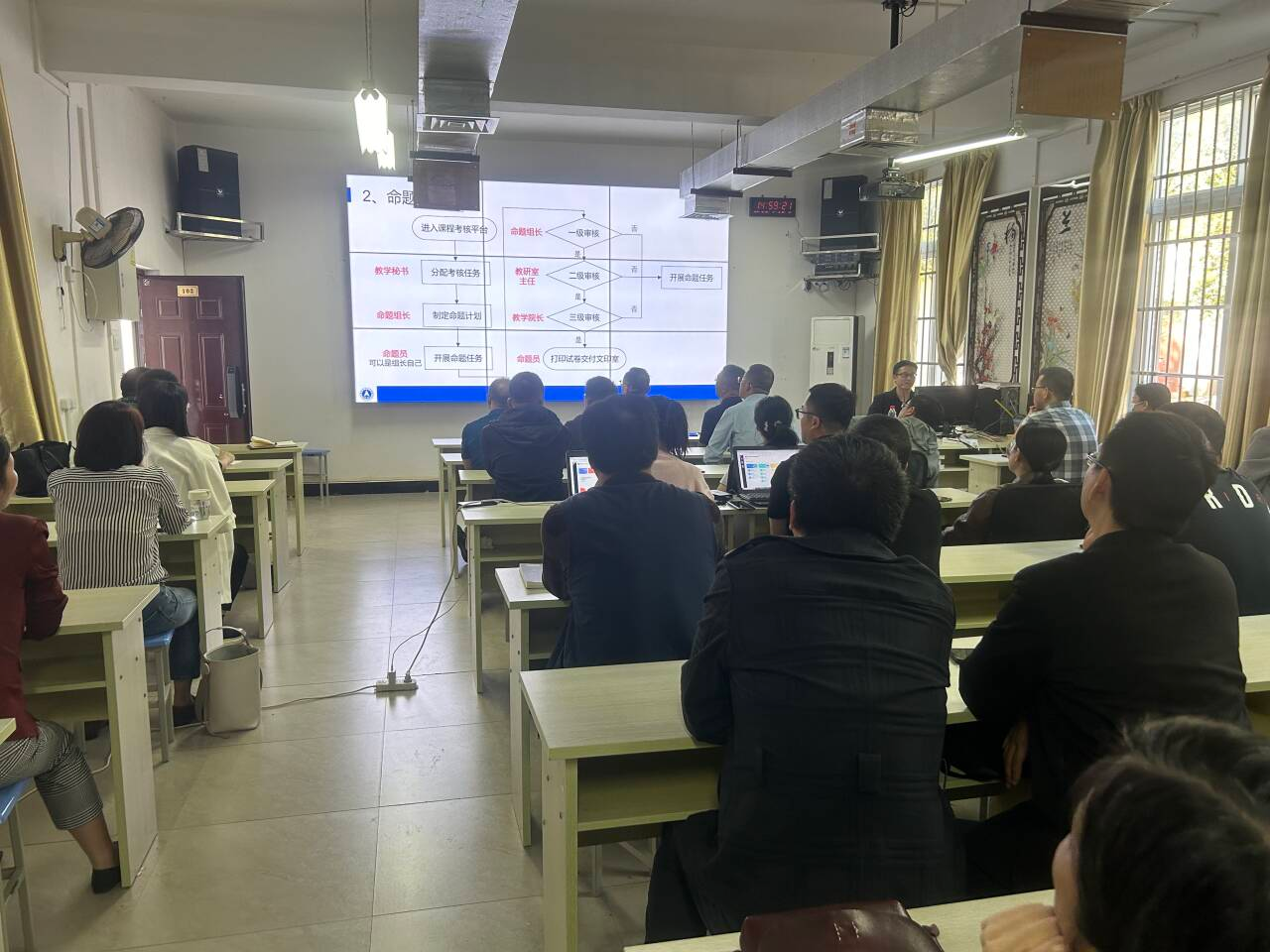刘翔老师详细讲解了平台简要概述、考前命题、考后阅卷、系统优点等多个模块的功能与操作,并进行了实例演示。各位专业教师认真聆听,积极参与互动,培训结束后,通过教师们交流并对提出的常见疑问进行了解答。