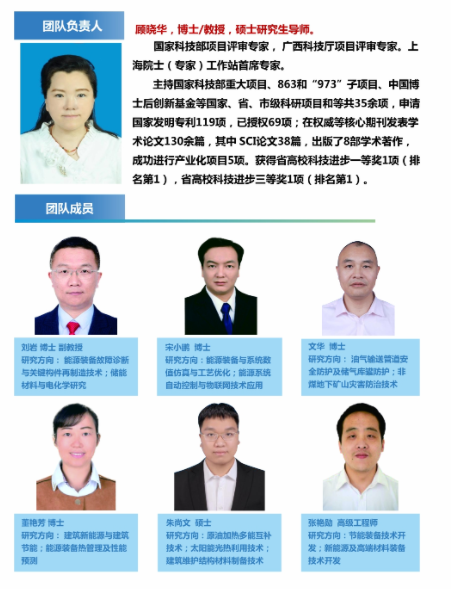 团队是广西高校清洁能源装备与节能技术重点实验室、学校创新团队等科研平台的重要组成。立足国家“双碳”战略目标和区域经济发展需求,围绕清洁能源利用与开发、固废资源化利用、节能与低碳、能源装备再制造、高端宇航装备等新兴产业的关键技术,致力于建立能源转化与洁净利用新模式和新方法,加速新技术的推广应用和传统技术的升级和换代。在科技部重点研发项目、自然科学基金、省自然科学基金以及产学研合作项目等多项省部级以上课题的支持下,在低碳清洁能源转化机理与优化设计、绿色低碳循环以及能源装备再制造、高端宇航技术装备等研发方向开展基础理论、关键技术及工程应用,取得系列成果,成功完成了多个行业的科技服务的产学研项目成果转化、工程试验与示范。下设四个主要研究子方向: